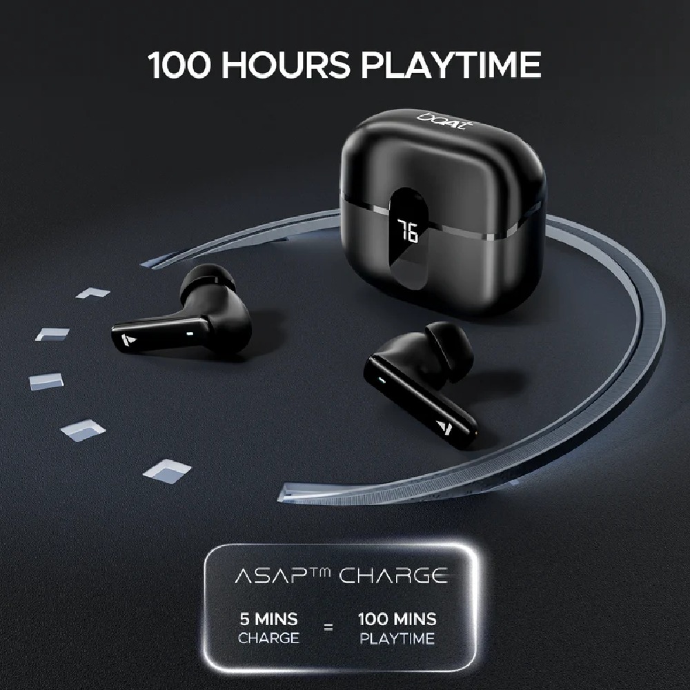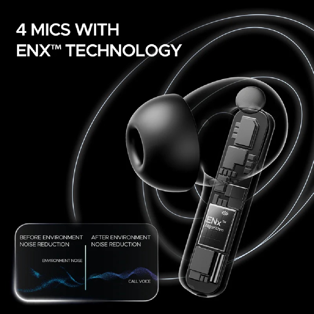 - Features: Active Noise Cancellation (Up to 32 dB), Transparency Mode, ENx™ Quad-Mic Technology, BEAST™ Mode (~65 ms Low Latency), In-Ear Detection, IWP™ (Instant Wake N’ Pair), Touch Controls, IPX5 Water & Sweat Resistance