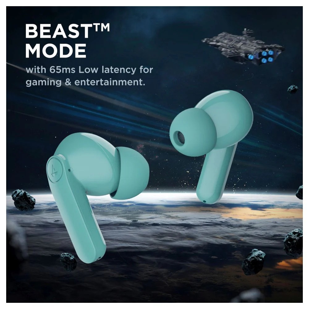 - Features: ENx™ Noise Cancellation (Quad-Mic), BEAST™ Mode for Low Latency (~65 ms), IPX5 Water & Sweat Resistance, One-Touch Voice Assistant Access