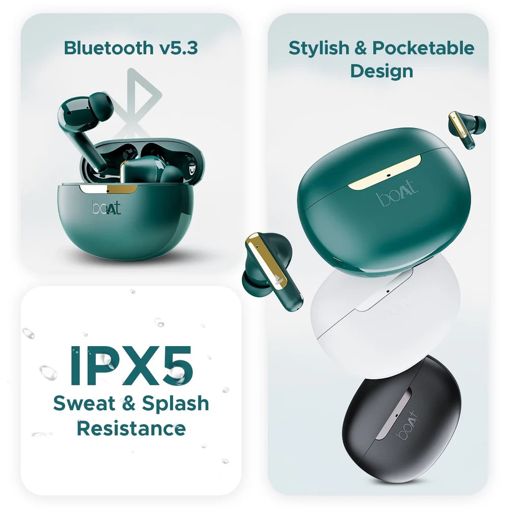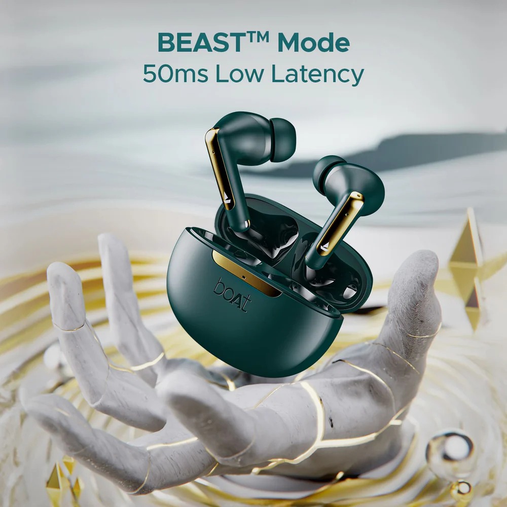 - Features: Up to 32 dB Active Noise Cancellation (ANC), Dual EQ Modes (Signature & Balanced), BEAST™ Mode (≈ 50 ms Low Latency), Quad-mic ENx™ Technology for Clear Calls, IPX5 Water & Sweat Resistance, ASAP™ Charge for Quick Top-ups