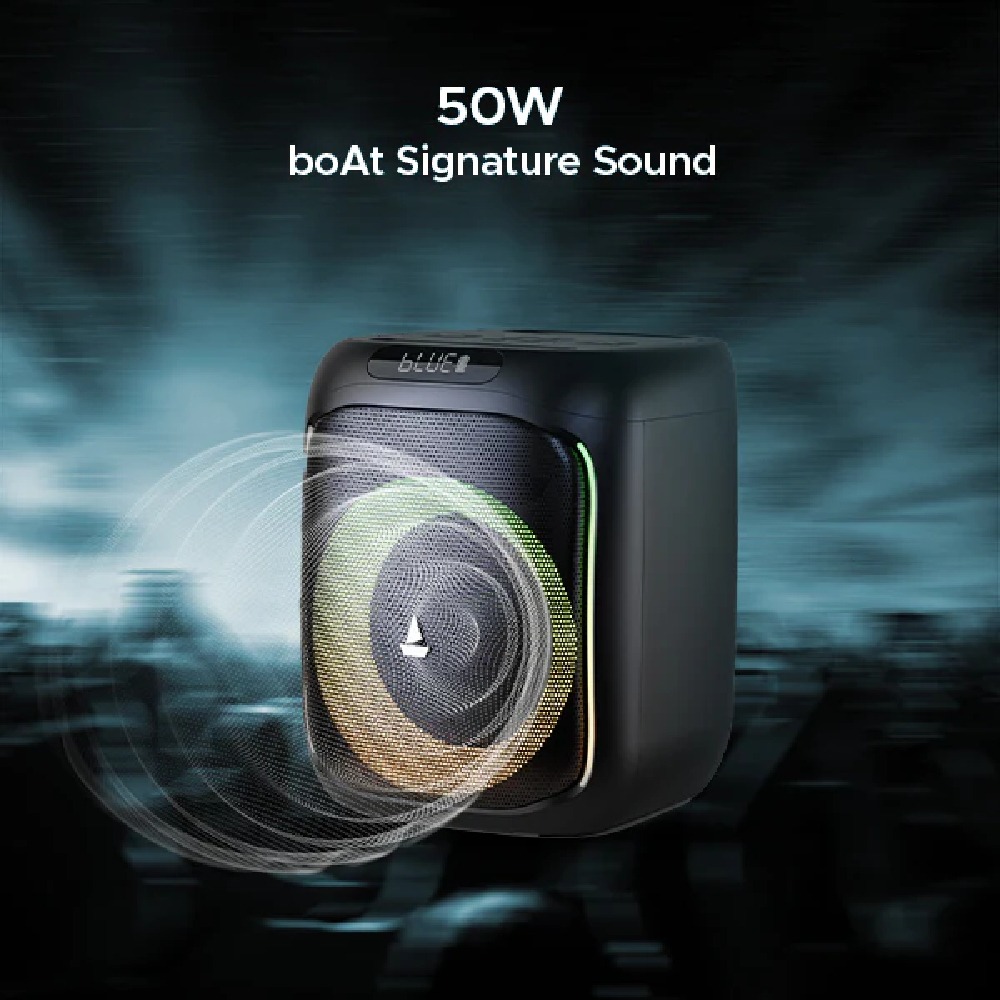 The boAt Party Pal 185 delivers booming 50W audio with deep bass and clear highs, perfect for parties, music, and outdoor gatherings.
