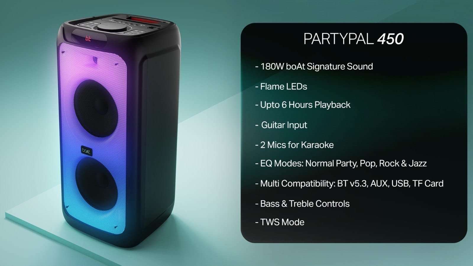 The boAt Party Pal 450 delivers booming 180W audio with deep bass and clear highs, perfect for parties, music, and outdoor gatherings.