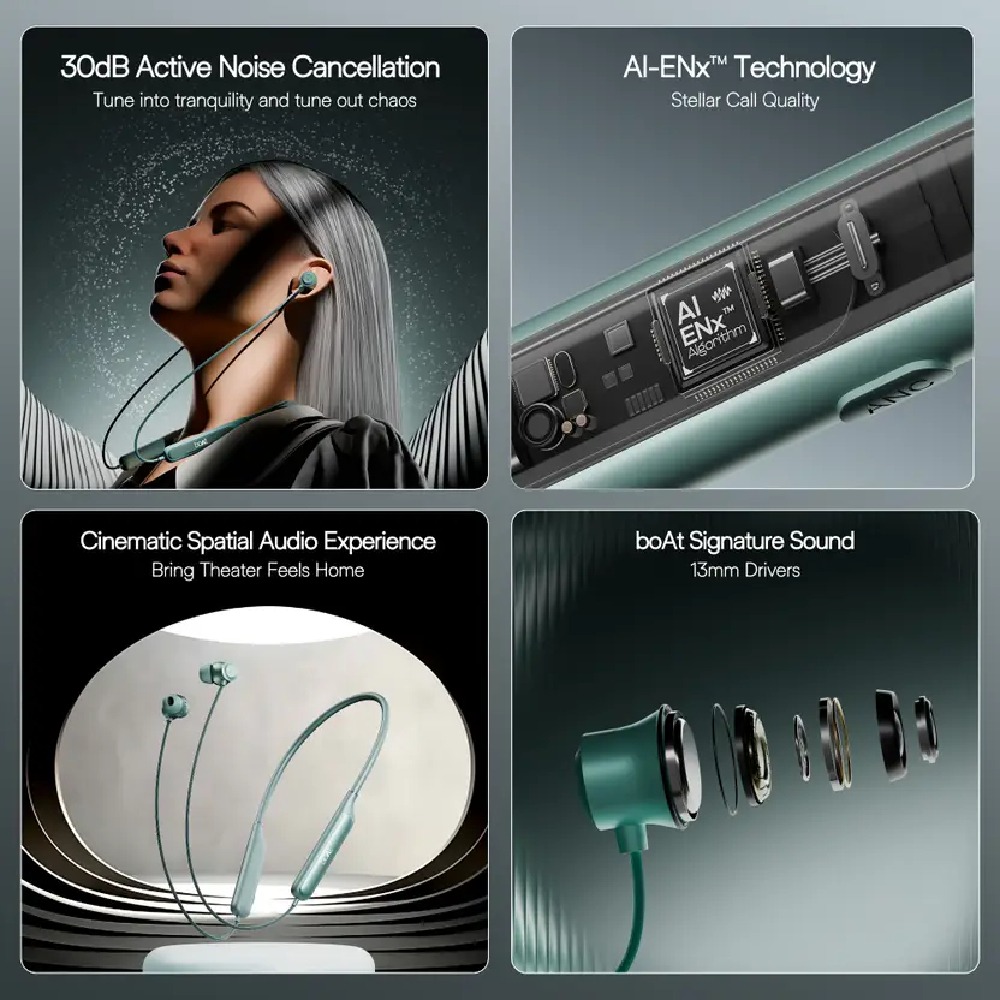 • Features: Active Noise Cancellation (up to 30 dB), AI-ENx™ Technology for Clear Calls, Cinematic Spatial Audio, BEAST™ Mode (~60 ms Low Latency), Magnetic On/Off with Hall Sensor, IPX4 Water & Sweat Resistance, Dual Device Pairing, Voice Assistant Support