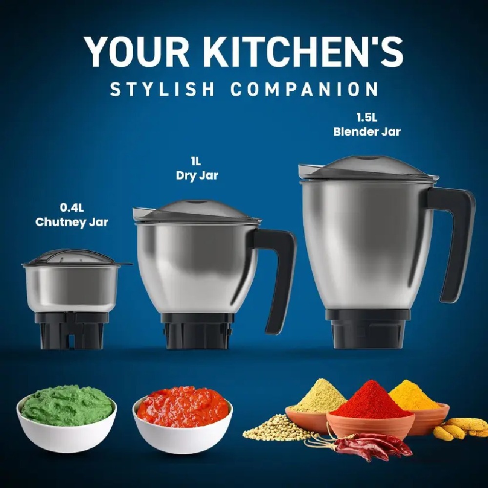 Includes three jars: 1.5L liquidizing jar, 1L dry grinding jar, and 0.5L chutney jar. Made of high-quality stainless steel for durability and corrosion resistance.