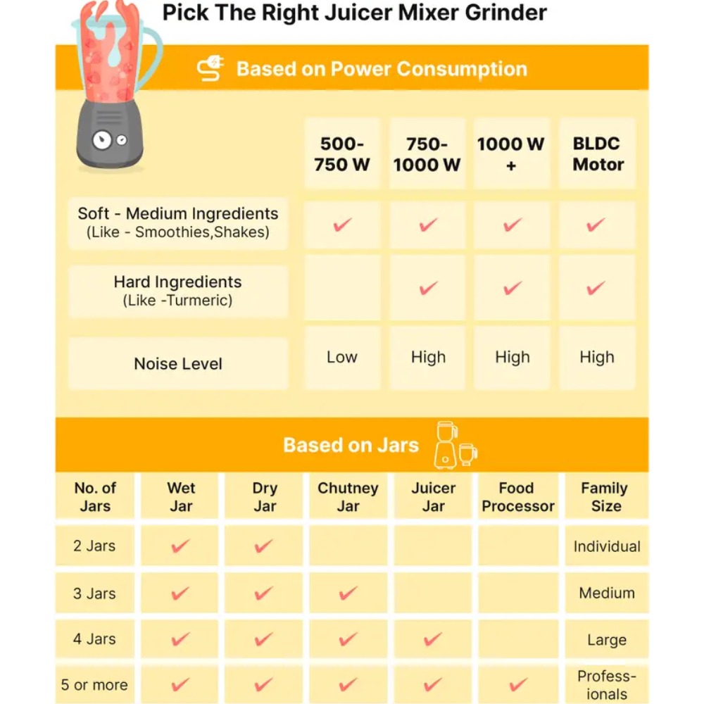 Comes with three jars: a 1.5L liquidizing jar, a 1L dry grinding jar, and a 0.5L chutney jar. All jars are made of high-quality stainless steel, ensuring durability and resistance to corrosion.