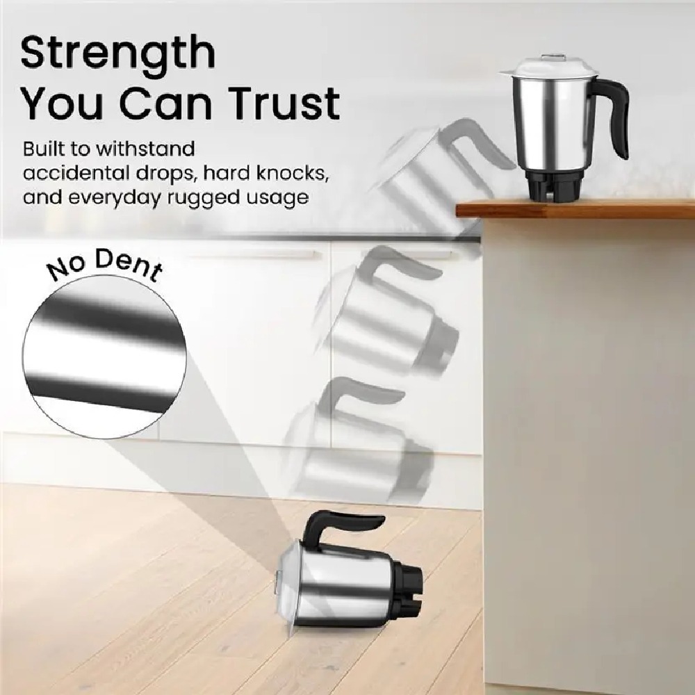 Includes three jars: 1.5L liquidizing jar, 1L dry grinding jar, and 0.5L chutney jar. Made of high-quality stainless steel for durability and corrosion resistance.