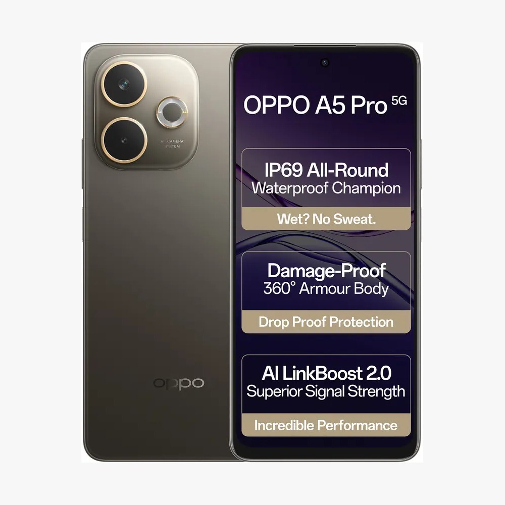 With 14 military-grade tests passed, bionic cushioning, an aluminium motherboard cover, and 160% stronger shatter-resistant glass, the OPPO A5 Pro 5G is engineered to handle drops and shocks with ease.